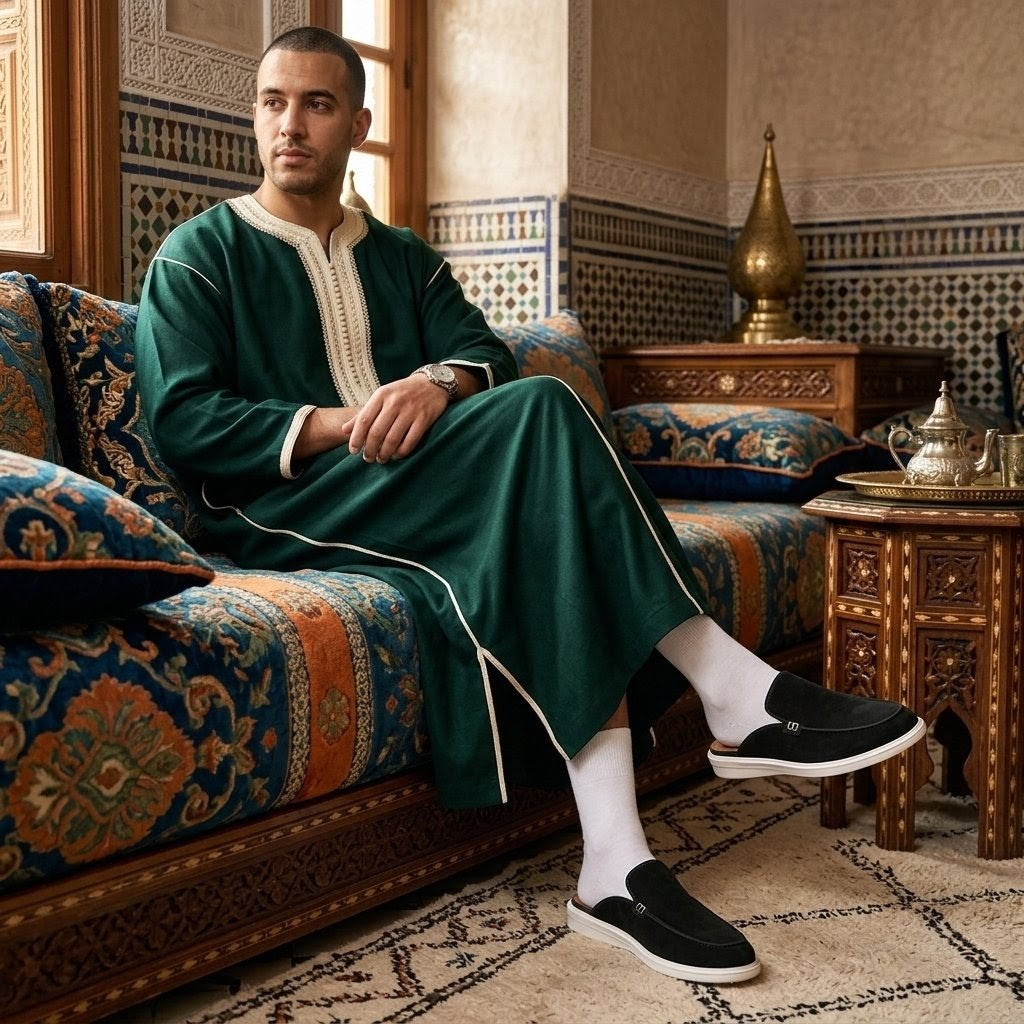 La tige en cuir prend vie grâce au travail minutieux de nos artisans marocains.